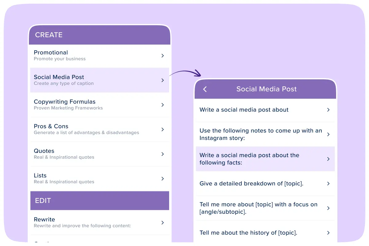 Get instant access to proven copywriting formulas like AIDA and ACCA, plus ready-made prompts for quotes, lists, and promotional content - so you're never staring at a blank prompt box wondering what to write.