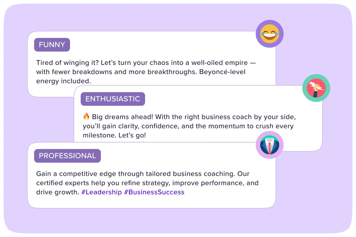 Pick the perfect tone of voice for every post, ensuring brand consistency or enabling vibrant variety.