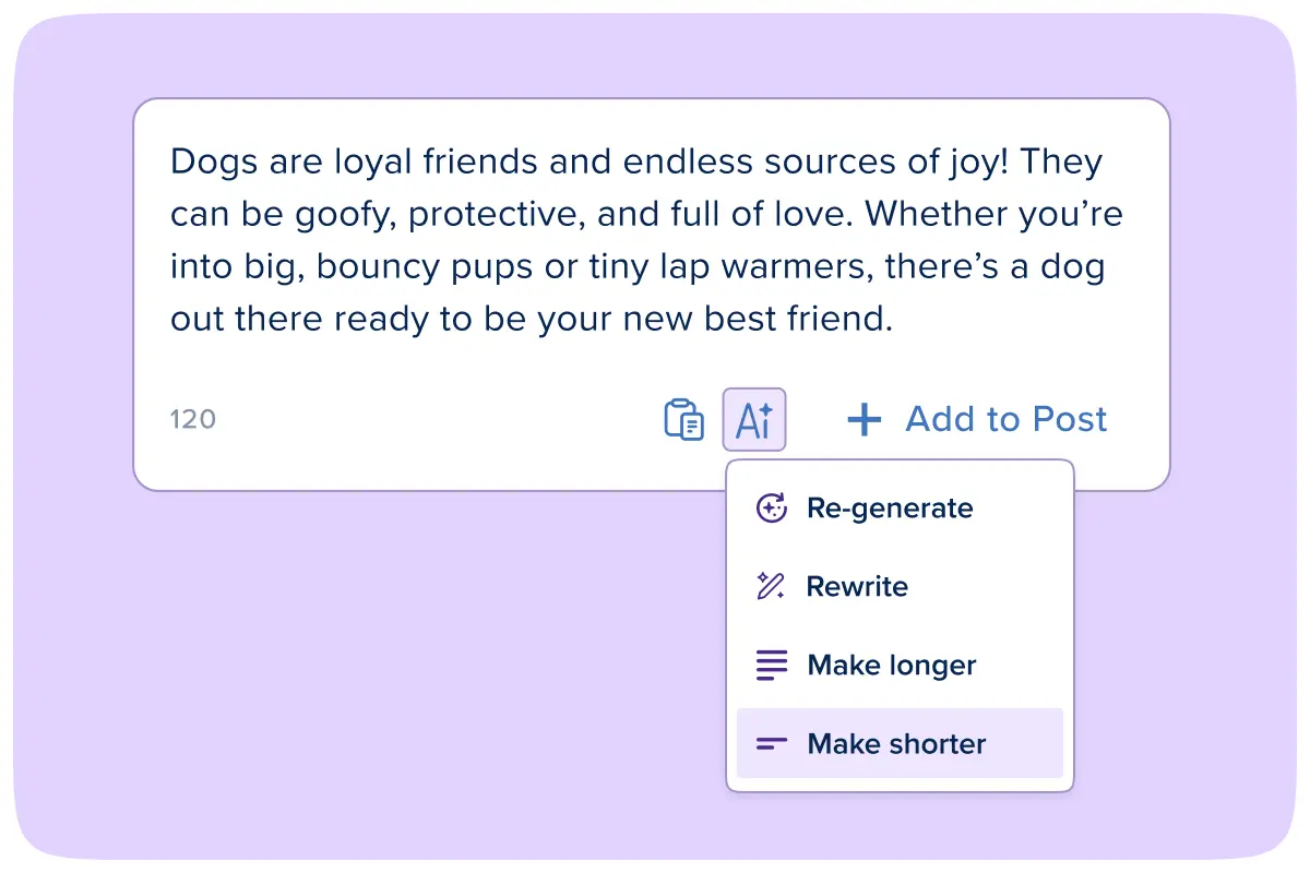Transform your content creation workflow using AI that writes like a pro. Fill your queue with a week's worth of posts in seconds. It's like having your own personal copywriter that never runs out of ideas and knows exactly how to engage your audience.