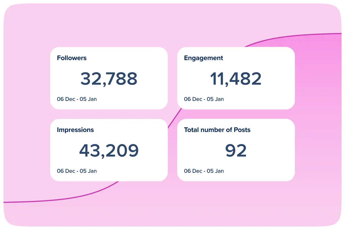 Get a complete overview of your social media performance at a glance. View key metrics like total followers, engagement, impressions, and posts published for any time period - either for individual profiles or aggregated across all your connected accounts to see your complete social media impact in one dashboard.