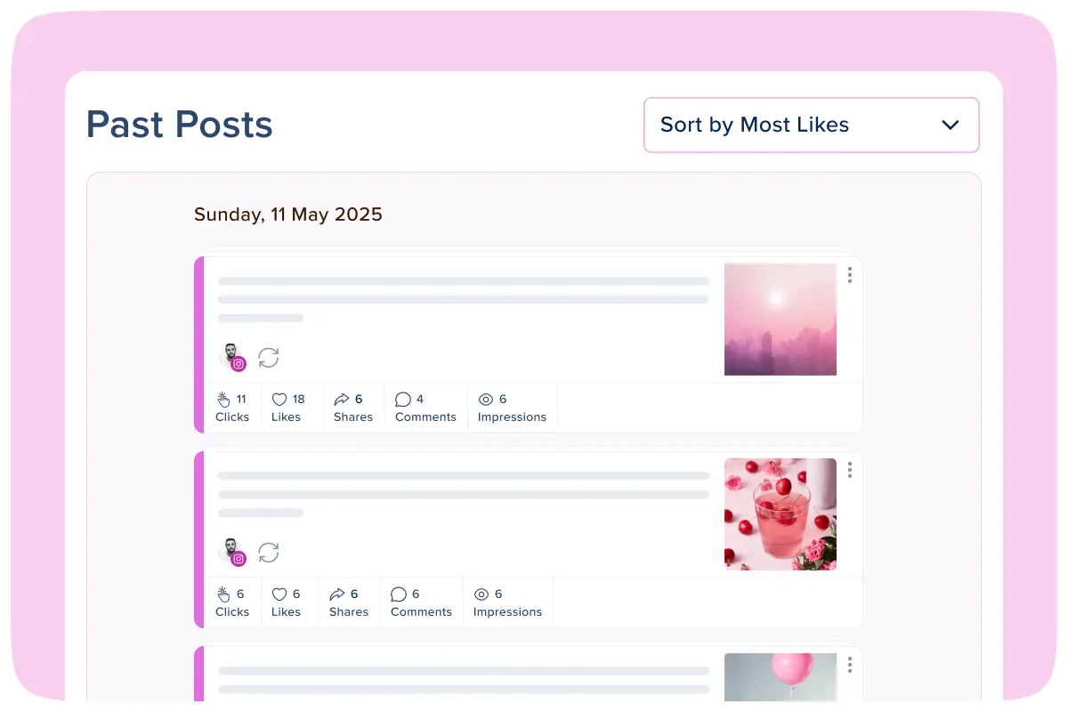 View detailed engagement metrics for every published post and sort by likes, comments, shares, or impressions to identify your top performers. Analyze what makes your best content successful and discover patterns in your highest-engaging posts to replicate that success.