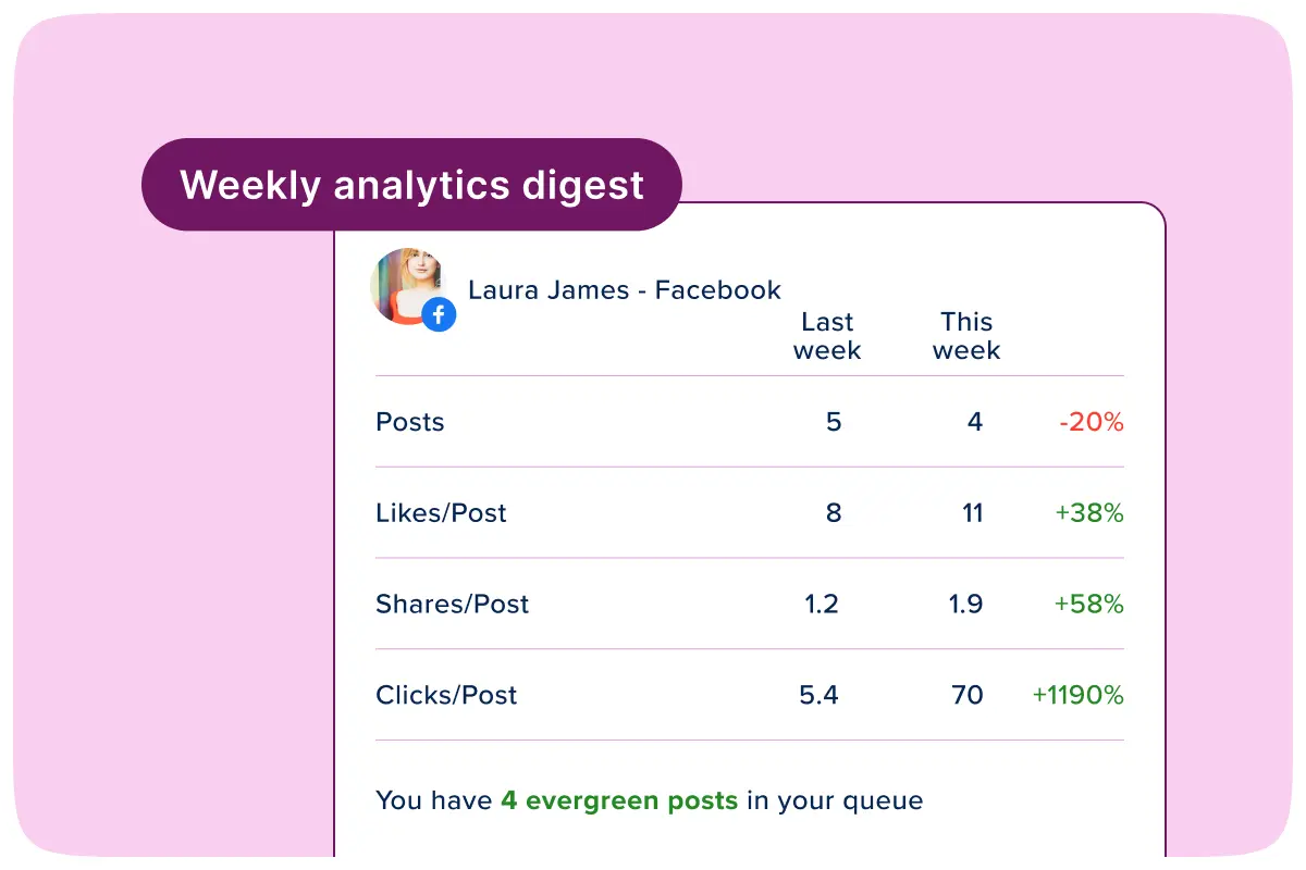 Get a clear week-over-week performance summary delivered to your inbox or viewed on-demand. Track follower growth, engagement trends, and posting consistency; and get warned if you're running out of content.